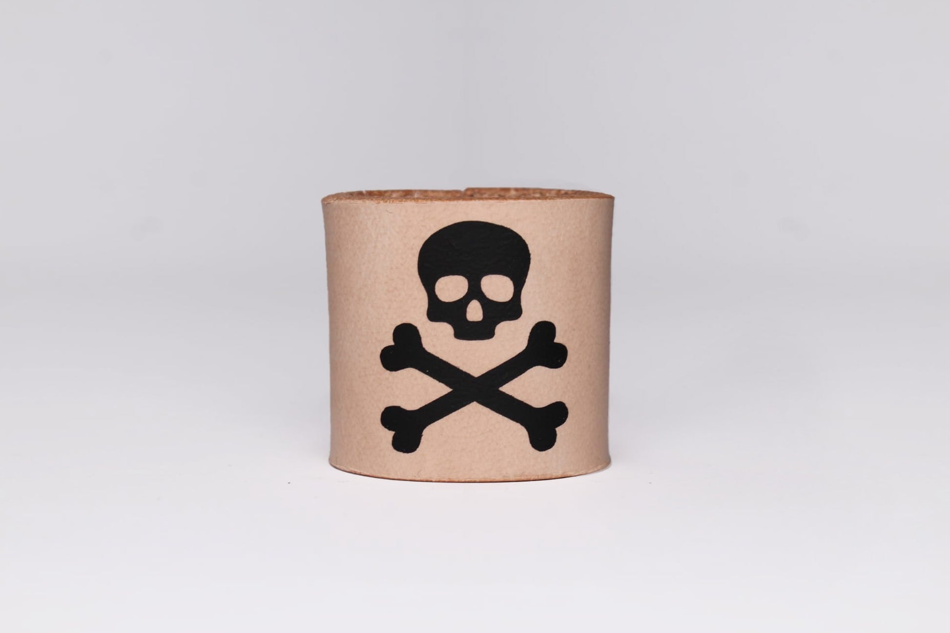 Hand crafted using genuine natural veg tanned leather, featuring a hand-painted skull and crossbones and finished with classic handstiching.