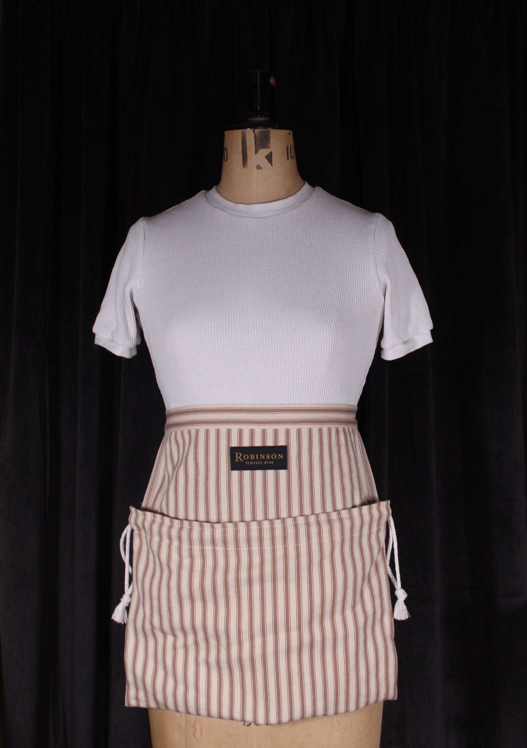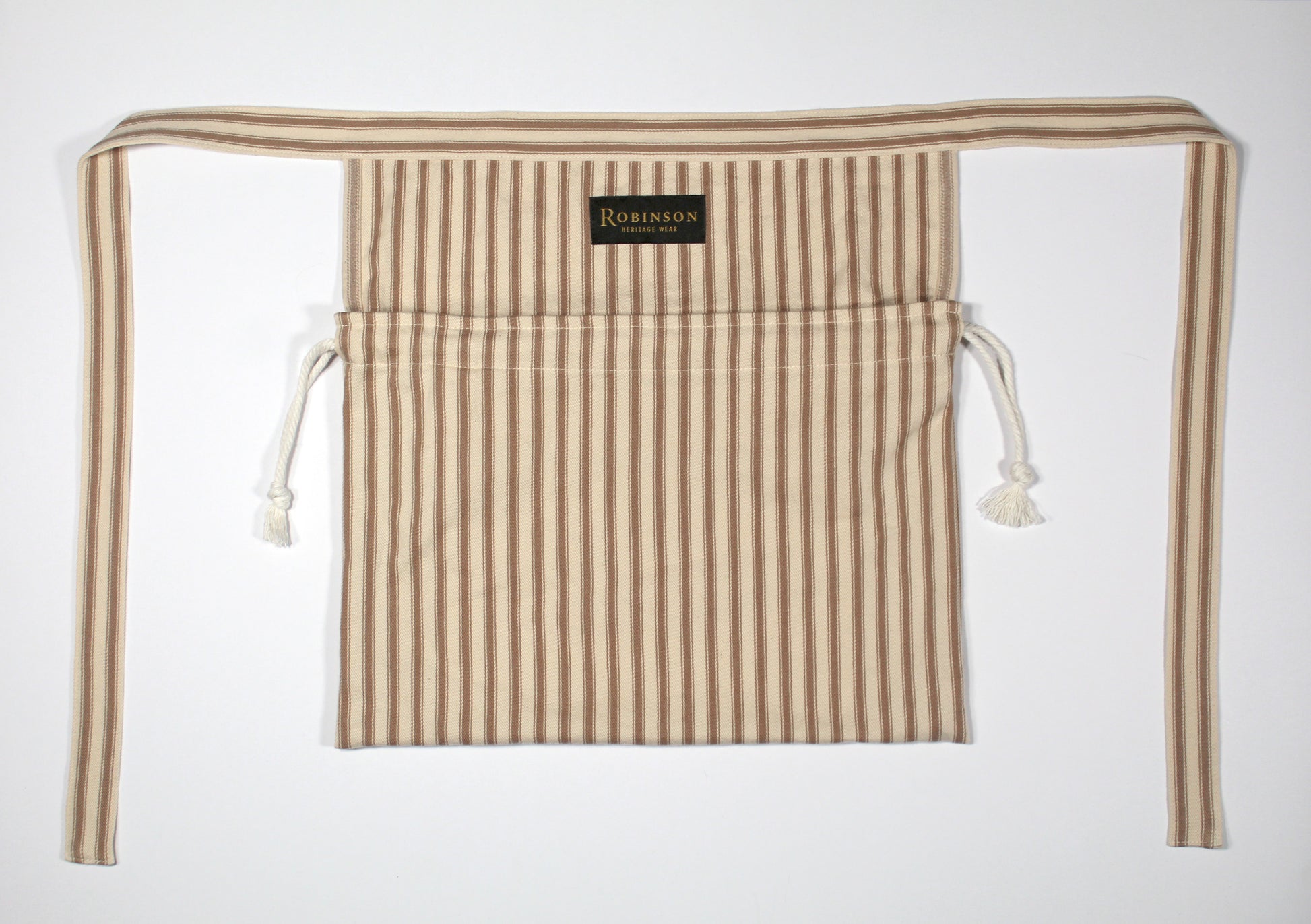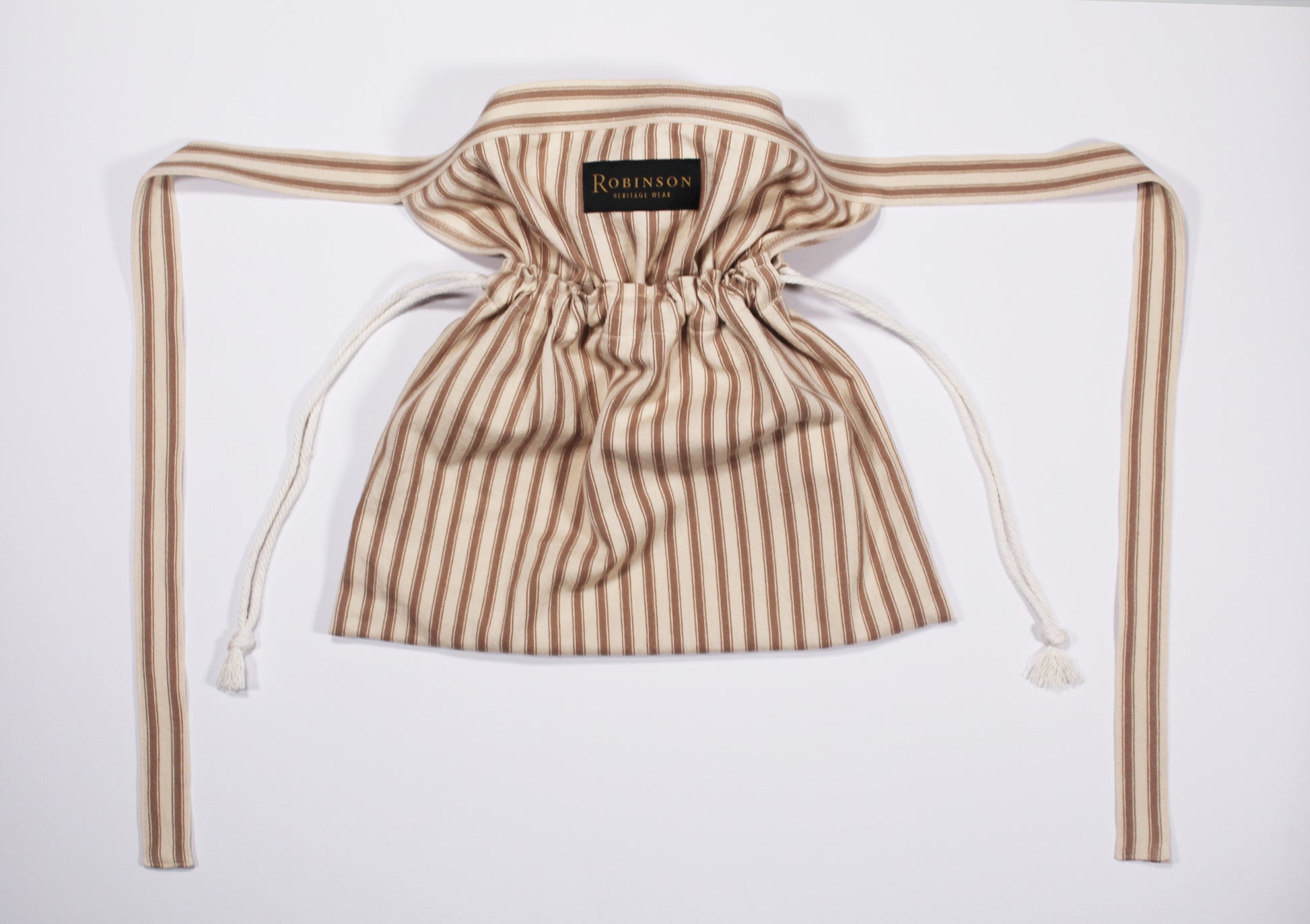 The 'Apron Ditty Bag' is based on an original WW2 American Red Cross bag. In line with the original design, it can be used in a variety of ways: as an apron tied around the waist, as a drawstring bag or you can tie the ends together to use as a shoulder bag. Our design comes with a couple of upgrades though - a large internal zip pocket to keep your valuables safe and a d-ring to secure your keys.